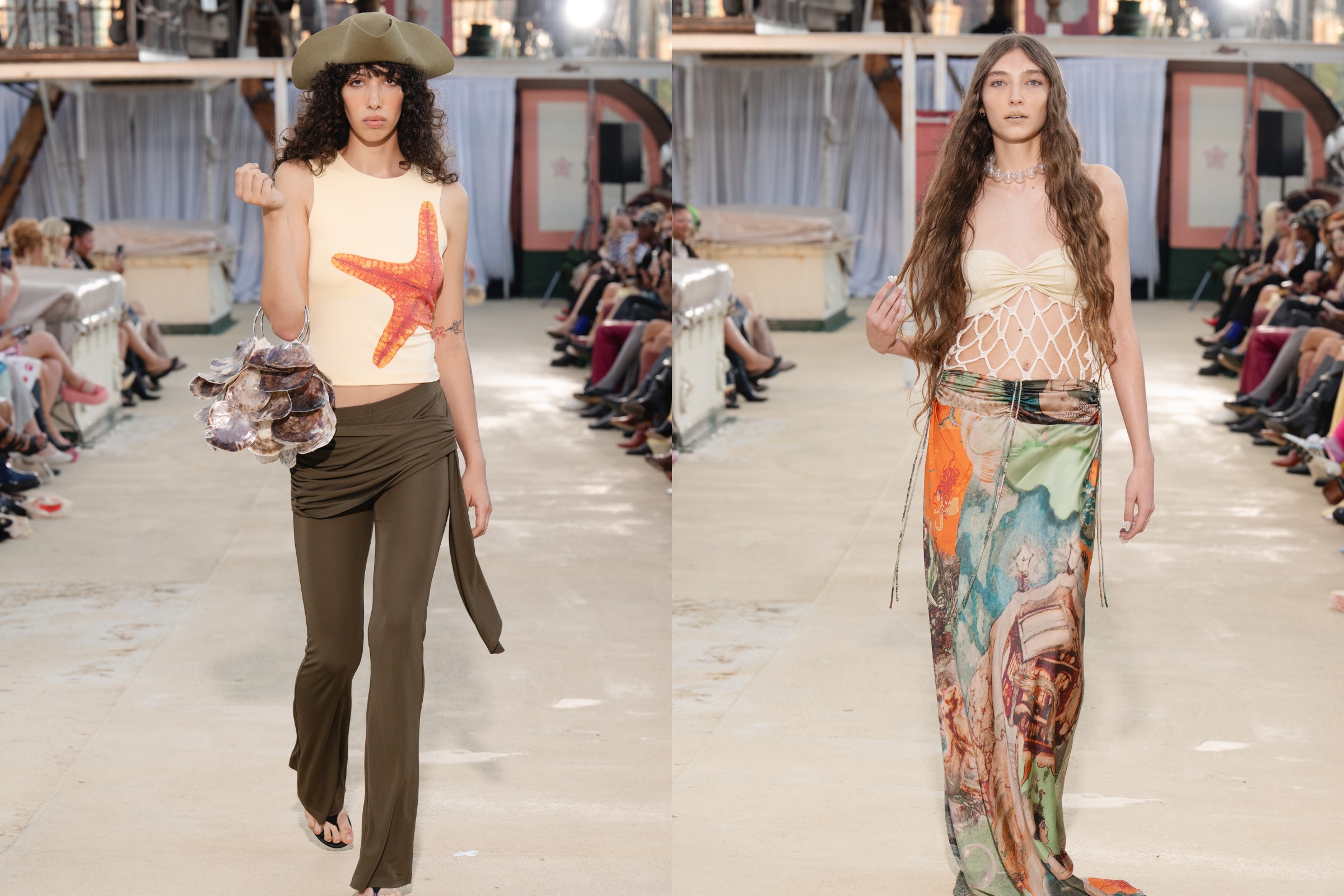 Tyler McGillivary’s “Mermaiden” show showcased glamorous nautically inspired pieces like a conch shell handbag and fishnet gown with a shell bra. Appropriately, the show took place upon the historic tall ship “Wavertree” at 89 South St., which is part of the South Street Seaport Museum. The final look — a moss-green gown — was modeled by Sara Paxton, who played a mermaid in the film “Aquamarine.”