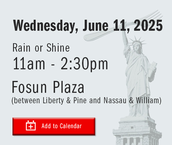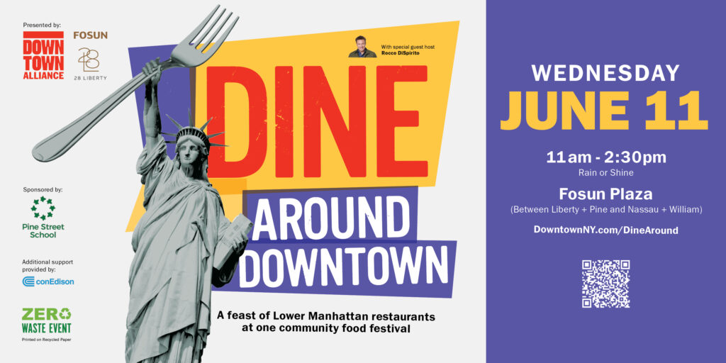Dine Around Downtown is back on Wednesday, June 11! Join us at Fosun Plaza (28 Liberty St.) for food, fun and more at Lower Manhattan’s premier tasting event from 11 a.m. to 2:30 p.m. rain or shine.