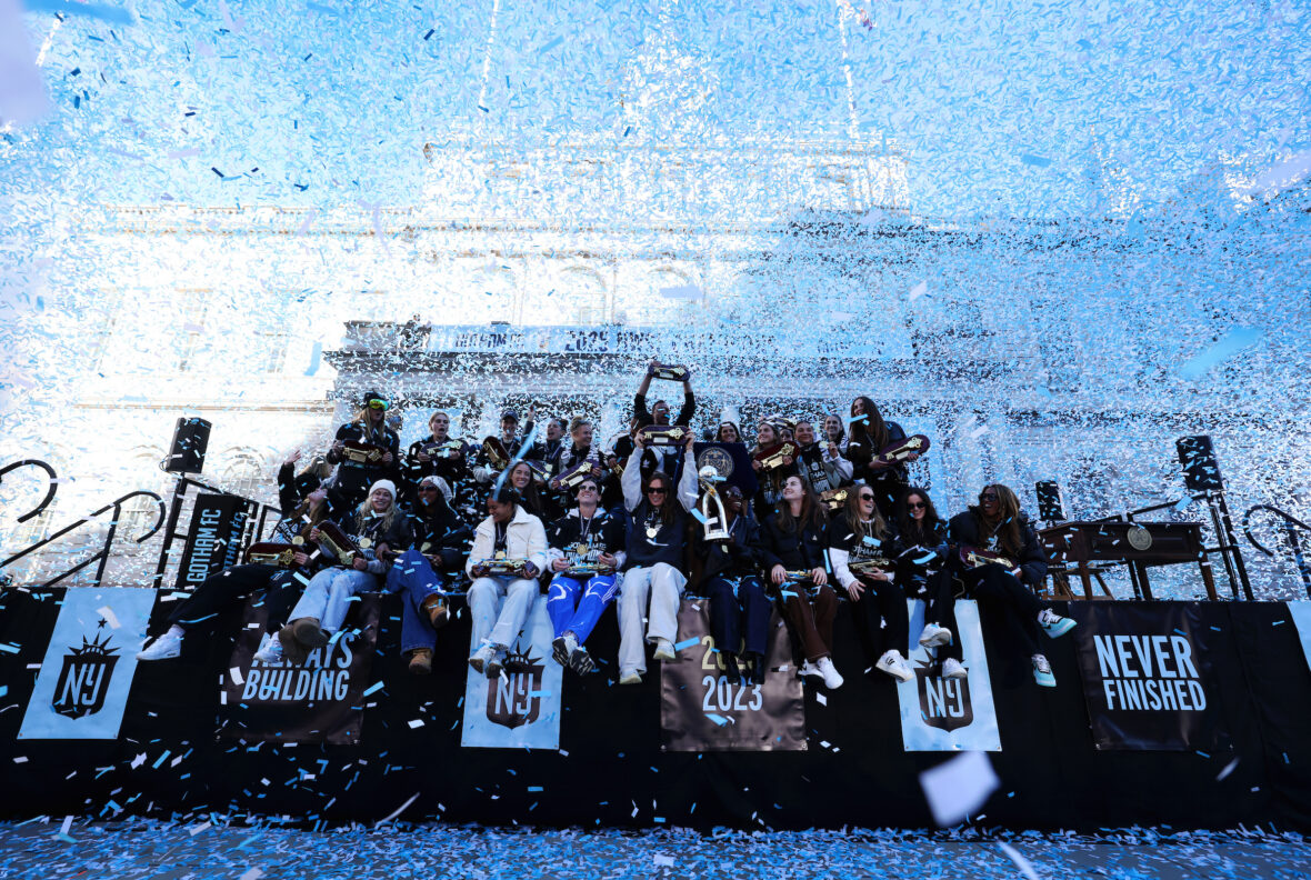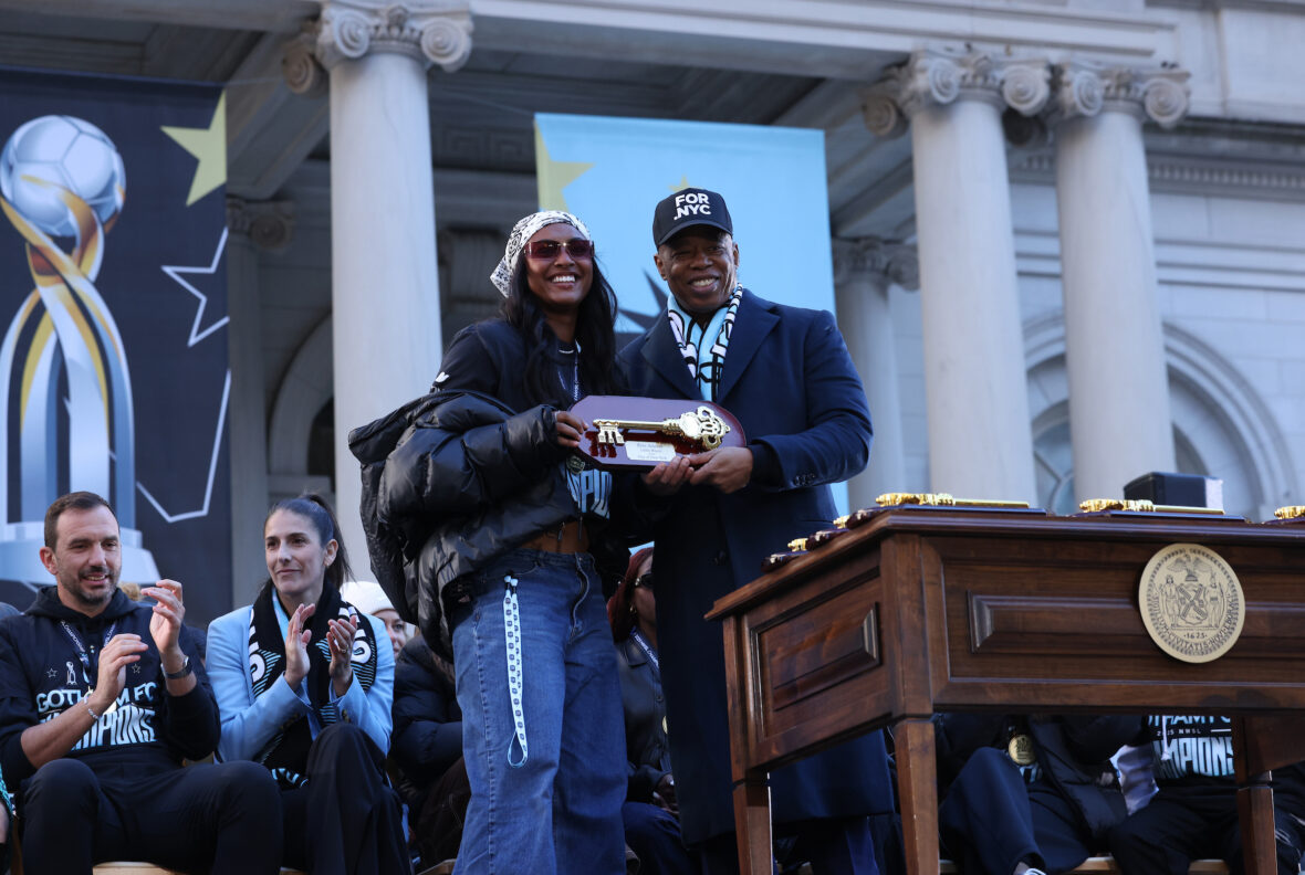Scroll through the gallery below for some pics from the festivities, which included ticker-tape (natch) and a speech from outgoing NYC mayor Eric Adams. Congratulations, Gotham FC!