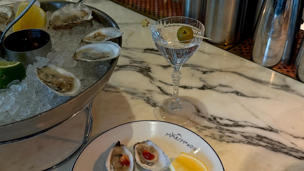 If your cocktail’s garnish isn’t enough to satiate your appetite, La Marchande’s happy hour menu also includes discounted bites. Oysters on the half-shell go for $12 per ½ dozen, and tater tots with spicy chili aioli for $8. And if you decide to revolt against the concept of happy hour entirely, feel free to add a “Caviar Accessory” to your tots — 20 grams will run you a cool $72. That’s the cost of nearly five more martinis, but hey, to each their own.